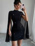 Round Neck Pearl Chiffon Cape Bodycon Dress Black Cape Dress Front View Black Cape Dress Side View Black Cape Dress Back View