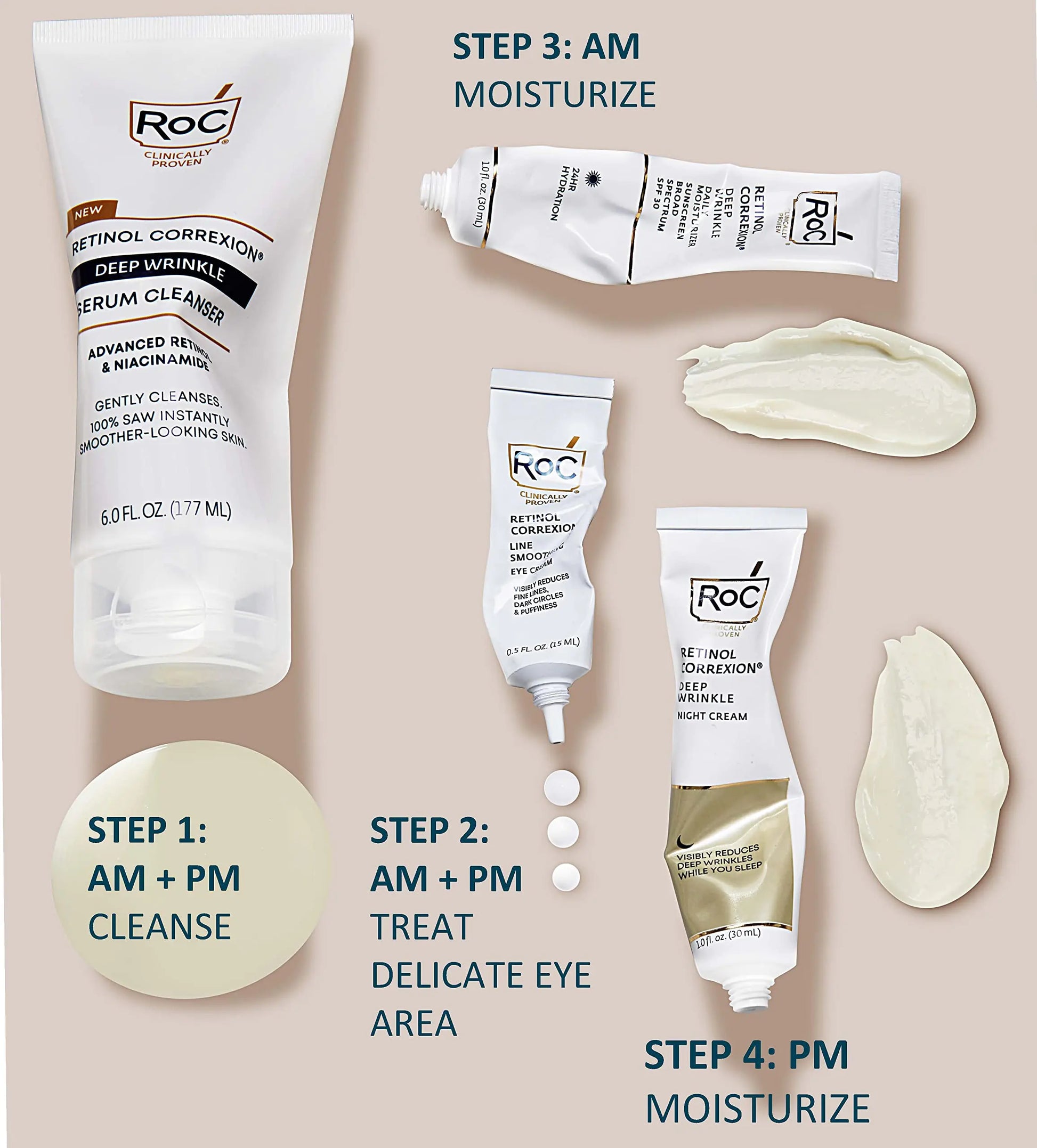 RoC Retinol Correxion Deep Wrinkle Serum Facial Cleanser with Niacinamide for Anti-Aging and Fine Lines, Long-Wear Makeup Remover, Fragrance Free Skin Care, Opthalmologist Tested, 6 Ounces